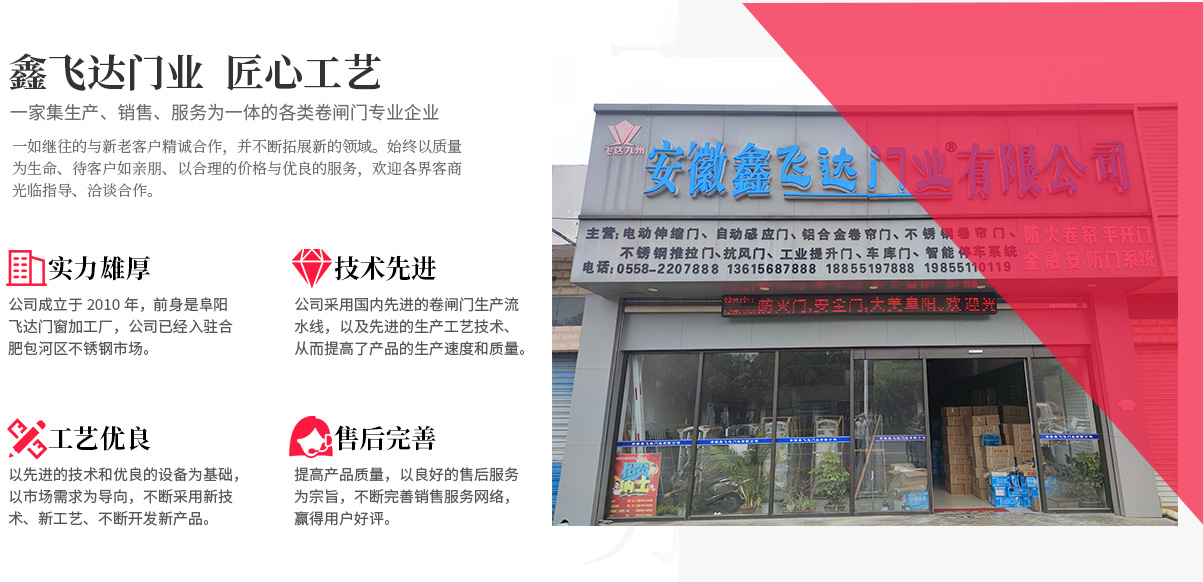 - 安徽鑫飛達門業(yè)有限公司成立于1998年,前身是阜陽飛達門窗加工廠,現(xiàn)在公司已經(jīng)入駐合肥包河區(qū)不銹鋼市場。本公司是一家集生產(chǎn)、銷售、服務(wù)為一體的各類卷閘門專業(yè)企業(yè)。公司采用國內(nèi)先進的卷閘門生產(chǎn)流水線,以及先進的生產(chǎn)工藝技術(shù)、從而提高了產(chǎn)品的生產(chǎn)速度和質(zhì)量。旗下?lián)碛酗w達九州和飛達門業(yè)兩個注冊商標。 產(chǎn)品種類齊全 ,質(zhì)量可靠,主要有不銹鋼推拉門,防火卷簾門,電動卷...